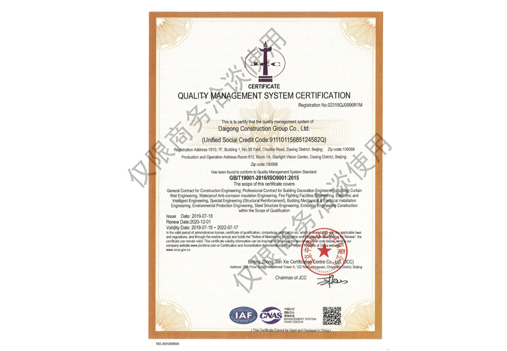 戴工建設集團有限公司,創建于2009年,注冊資本9888萬元人民幣。公司位于北京市大興區。具有建委頒發的建筑裝飾裝修專業壹級,防水保溫工程專業壹級,建筑幕墻專業貳級,消防設施專業貳級,電子與智能化專業貳級,特種工程(結構補強)專業不分等級,建筑機電安裝專業貳級,環保工程專業貳級,鋼結構專業貳級,建筑工程總承包貳級,建筑裝飾工程設計專項甲級,展覽陳列工程設計與施工壹級,展覽展示工程壹級...更多>>